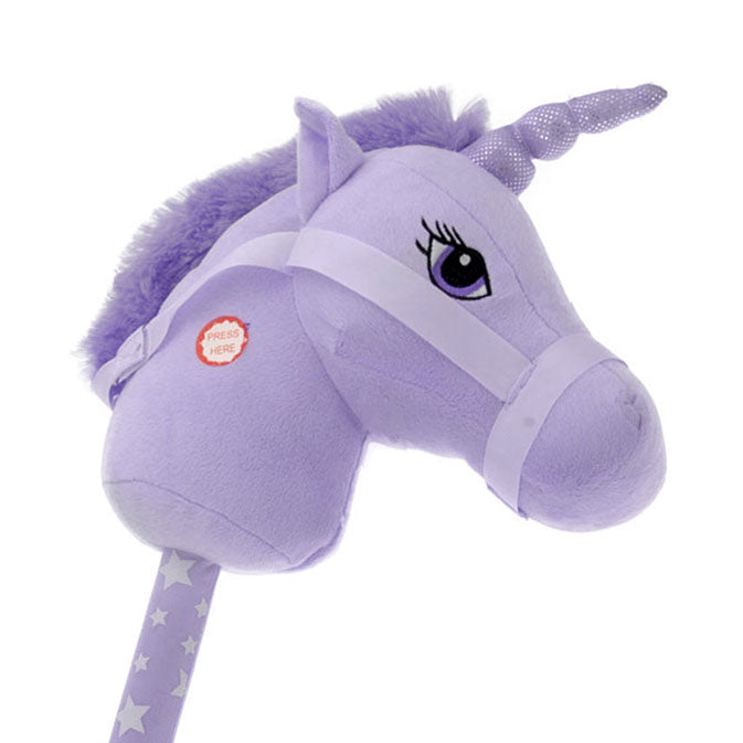 De paarse eenhoorn is gemaakt van pluche. Druk op de knop en de eenhoorn maakt geluid.