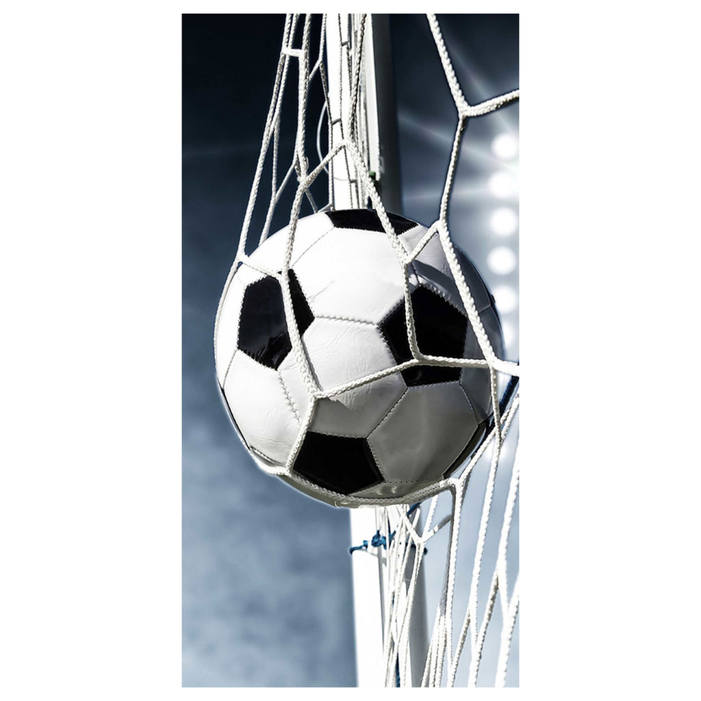 Strandlaken met afbeelding van een voetbal die in het doel wordt geschoten. Afmeting: 70 bij 140 cm.