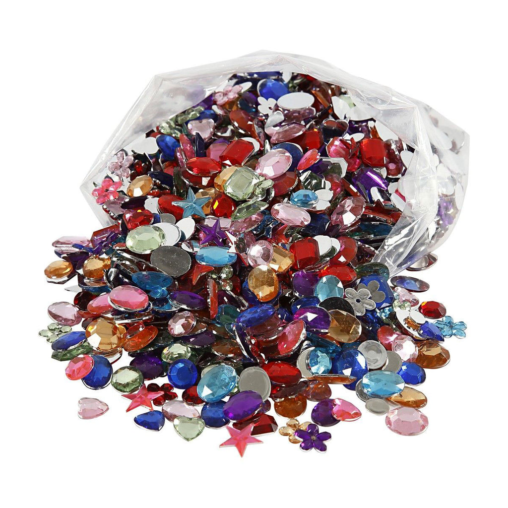 Ca. 1600 vrolijk gekleurde facet strasstenen in verschillende vormen met platte achterkant. Afmeting: 10-15 mm.