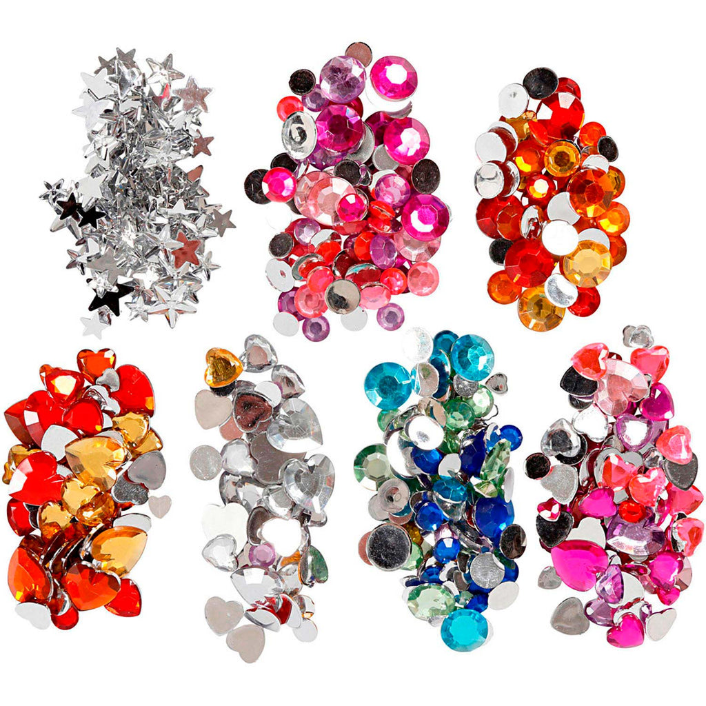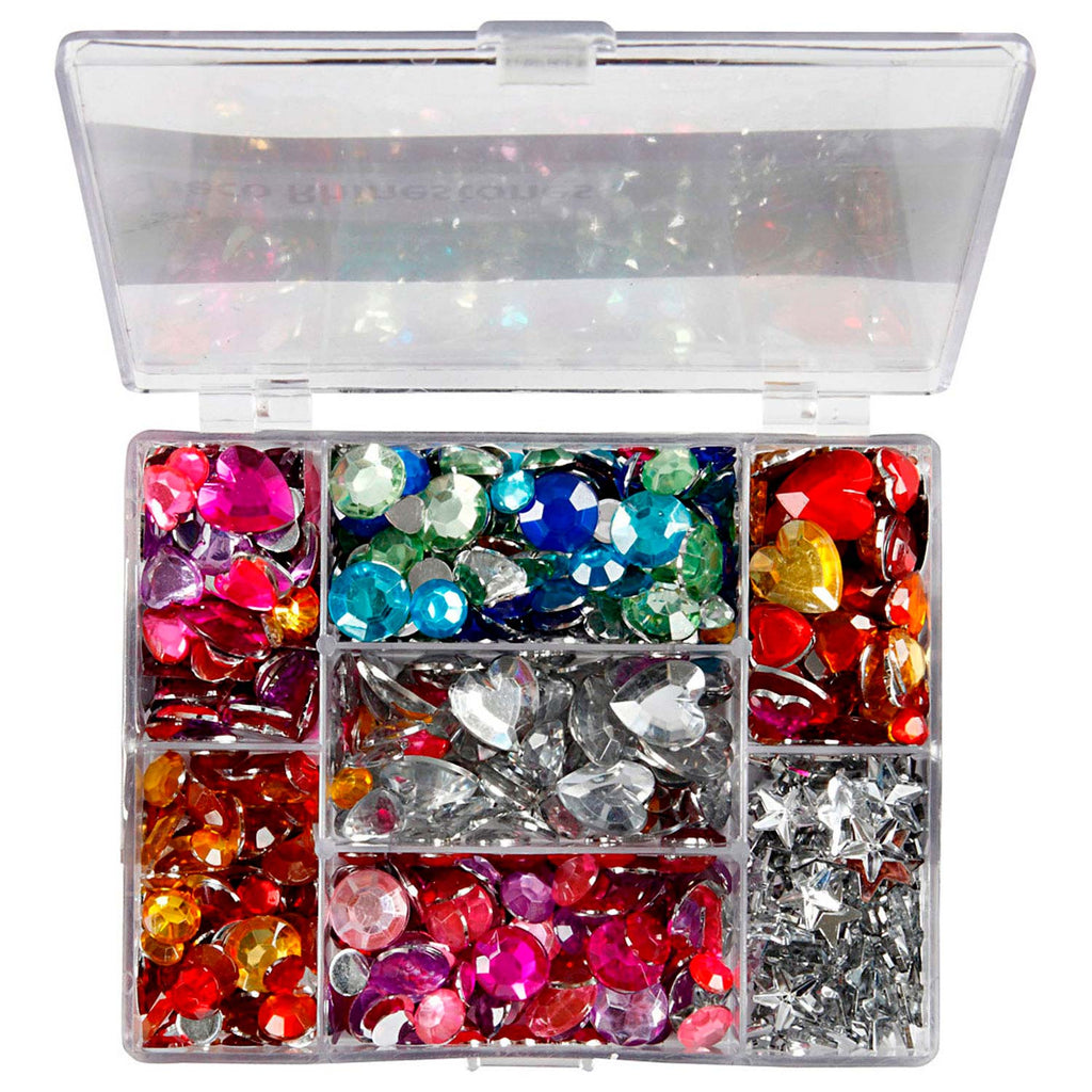 Wil jij je kunstwerken versieren met strasstenen? In deze set zitten 300 stuks verpakt in een handige transparante opbergbox met praktische vakken en een deksel. De strasstenen hebben in totaal 3 design in meerdere maten en kleuren. De afmetingen variëren tussen een doorsnede van 6 t/m 16 millimeter. De achterkant is plat zodat ze eenvoudig opgeplakt kunnen worden.