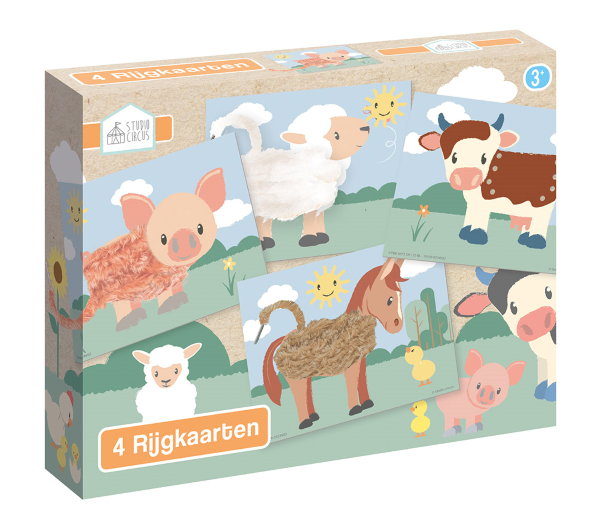 De kaarten bevatten herkenbare plaatjes van dieren op de boerderij. Rijgen is goed voor de ontwikkeling van de fijne motoriek.