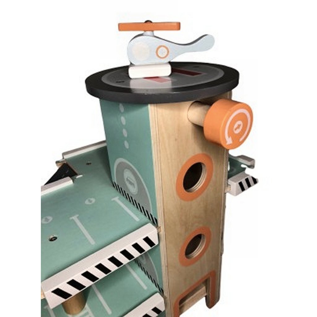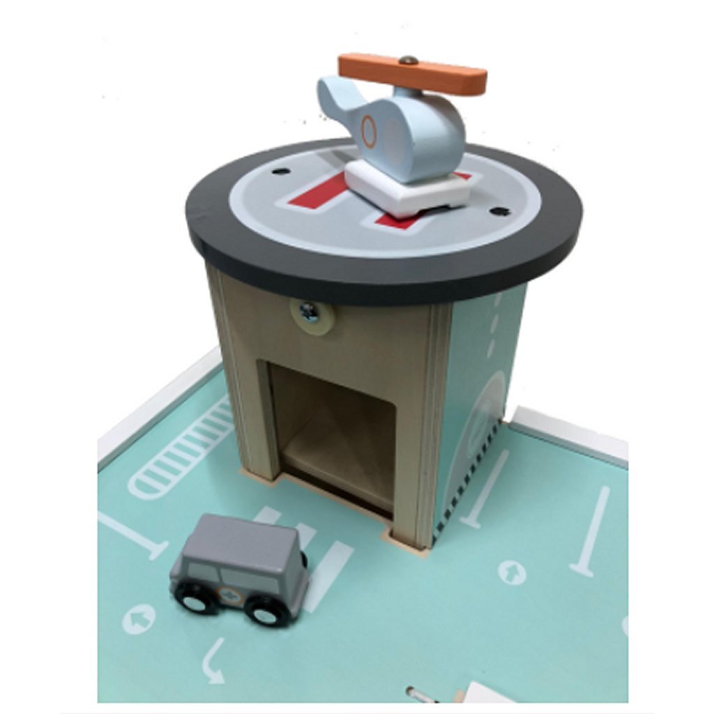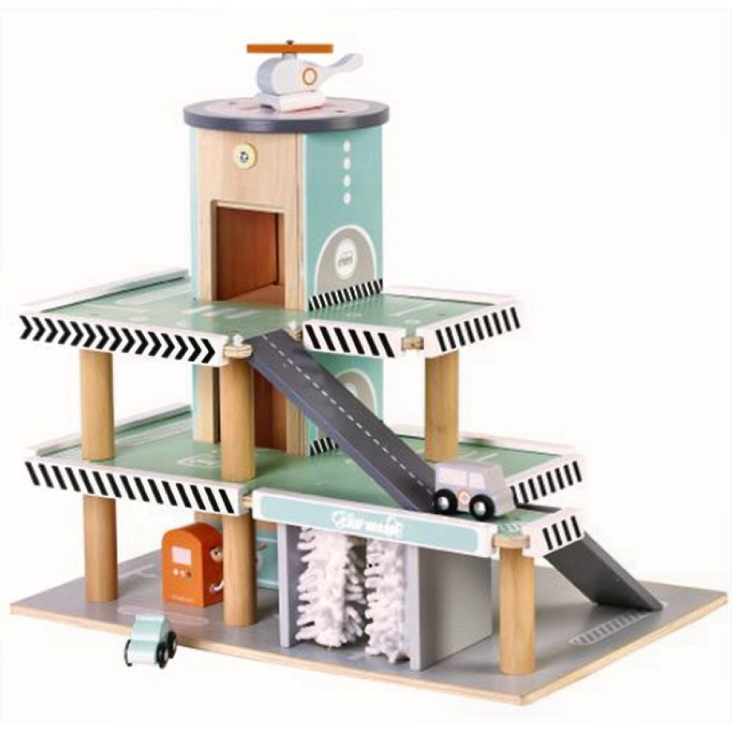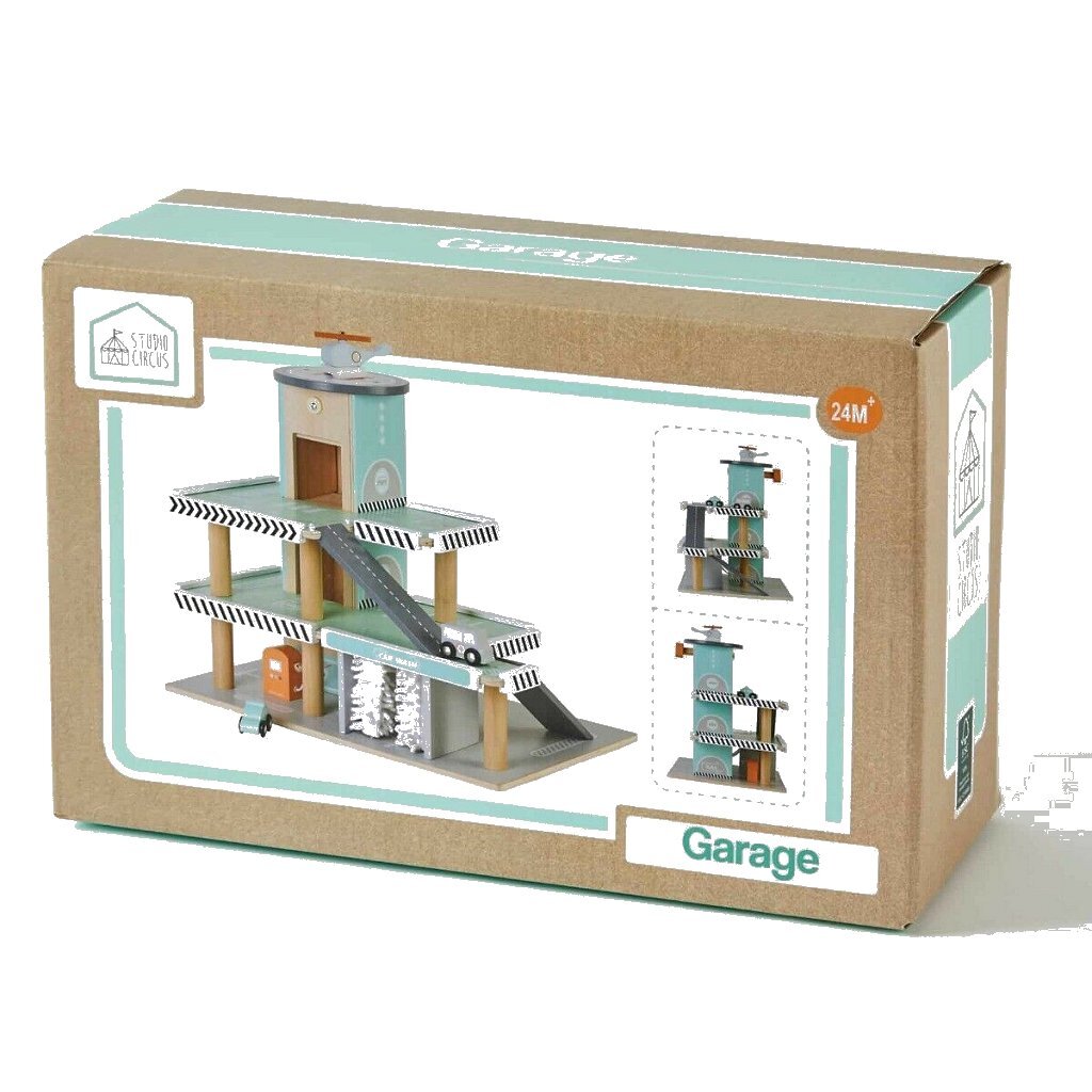 Mooie houten Studio Circus garage met meerdere verdiepingen. De garage heeft3 verdiepingen met hellingen, een autolift met een opwindmechanisme, een helikopterplatform, een benzinepomp en een wasstraat met twee wasrollen. Bij de garage horen 3 pastelkleurige voertuigen, een helikopter, een politieauto en een ambulance. Afmeting ca. 37 x 30 x 45 cm. Geschikt voor kinderen vanaf 24 maanden.