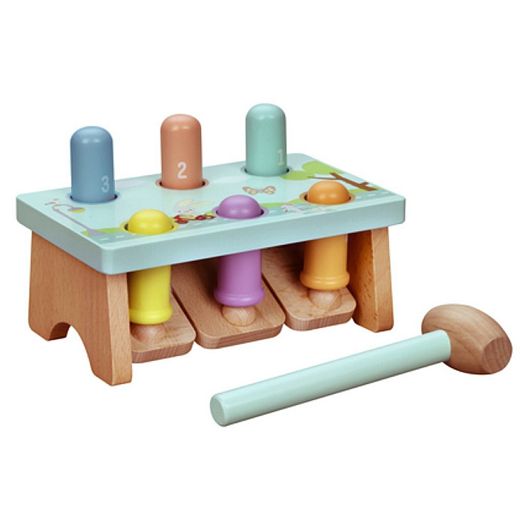 Met deze vrolijke, kleurrijke houten hamerbank raak je niet snel uitgespeeld! Sla de (niet verwijderbare) spijkers naar beneden en kijk hoe ze aan de andere kant omhoog komen. Het prikkelende en kleurrijke ontwerp bezorgt timmermannetjes en -vrouwtjes langdurig speelplezier! Een stevige hamer is inbegrepen. Helpt bij het herkennen van kleuren en verbetering van de fijne motoriek.