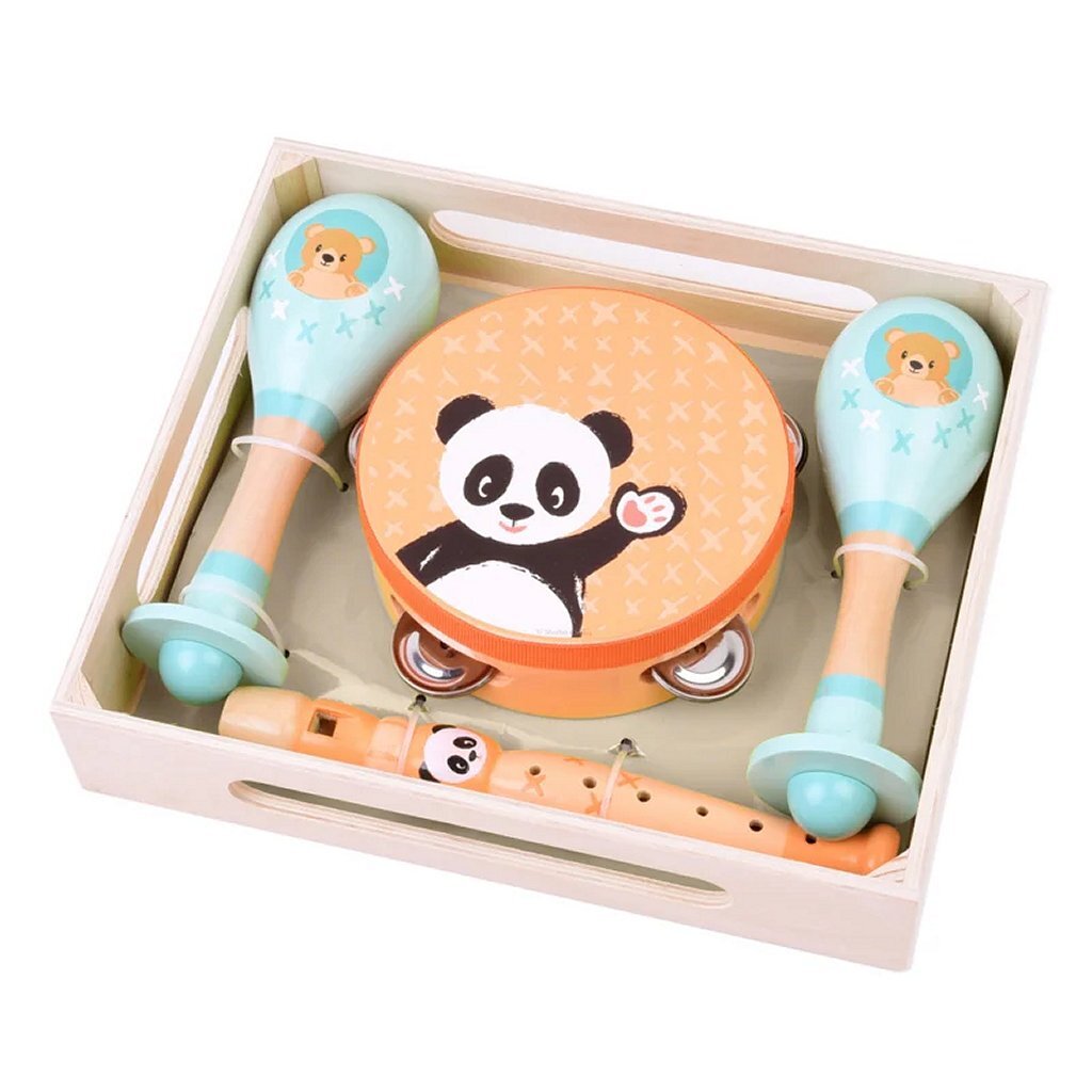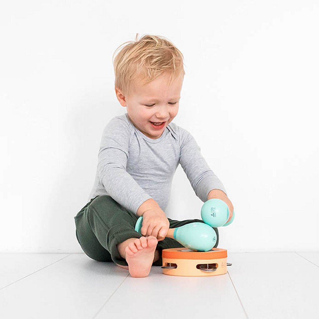 Maak kennis met de magie van muziek met deze houten instrumenten. De set in vrolijke kleuren bestaat uit een tamboerijn, 2 sambaballen en een blokfluit. Dat wordt een gezellige muzikale boel!?