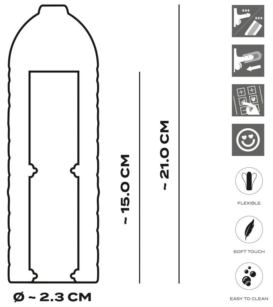 Totale lengte 21 cm, inbrengdiepte 15 cm, opening Ø 2,3 cm (rekbaar).