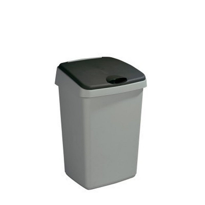 Zilvergrijze Sunware Delta prullenbak met een inhoud van 10 liter en een klep die open blijft staan indien gewenst.