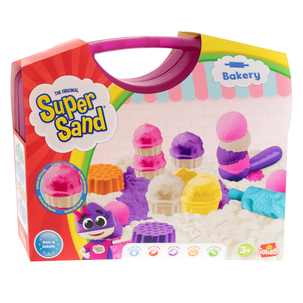 Met Super Sand kun je ook in huis met zand spelen. Dat klinkt fantastisch toch? Super Sand ziet eruit als normaal zand, maar het werkt als klei. Super Sand behoud zijn vorm zodat het niet als zandkorrels in elkaar stort. Super Sand heeft de handige eigenschap dat het alleen aan zichzelf plakt, zodat je het heel makkelijk op kunt ruimen. Dit voorkomt dat het hele huis vol met zand ligt na een middagje spelen. Het zachte zand kun je heerlijk in je handen kneden. Een handig alles-in-één opslag- en speelgebied. Thema: bakkerij.