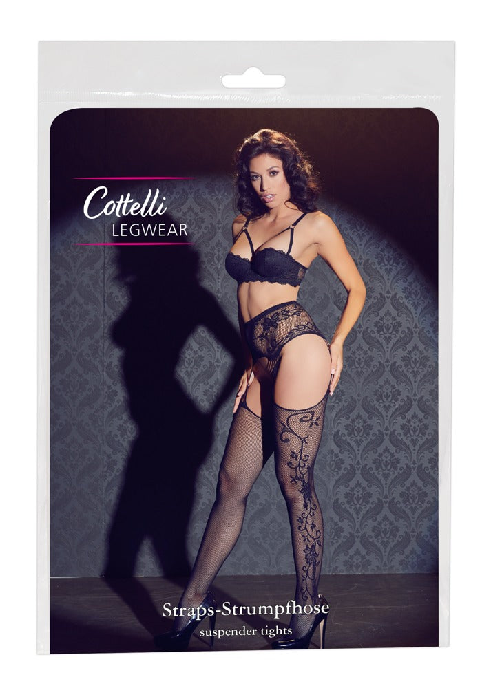 Seamless suspender belt made out of stretchy net with a tendril pattern and sewn-on stockings. There is also a wide tendril pattern down the sides of the stockings. With a reinforced toe part.