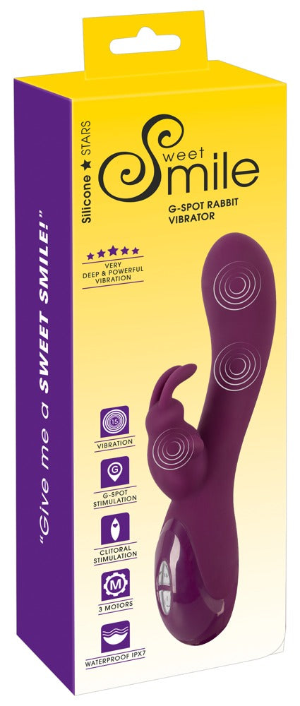 De G-Spot Rabbit vibrator van Sweet Smile met een fluweelzachte siliconen hoes maakt niet alleen indruk met zijn mooie uiterlijk en gevoel, maar ook met zijn vermogen. De gebogen, flexibele schacht en de clitorisstimulator met beweegbare oren verbergen in totaal 15 vibratiestanden om de vagina, G-zone en clitoris tegelijkertijd te verwennen.