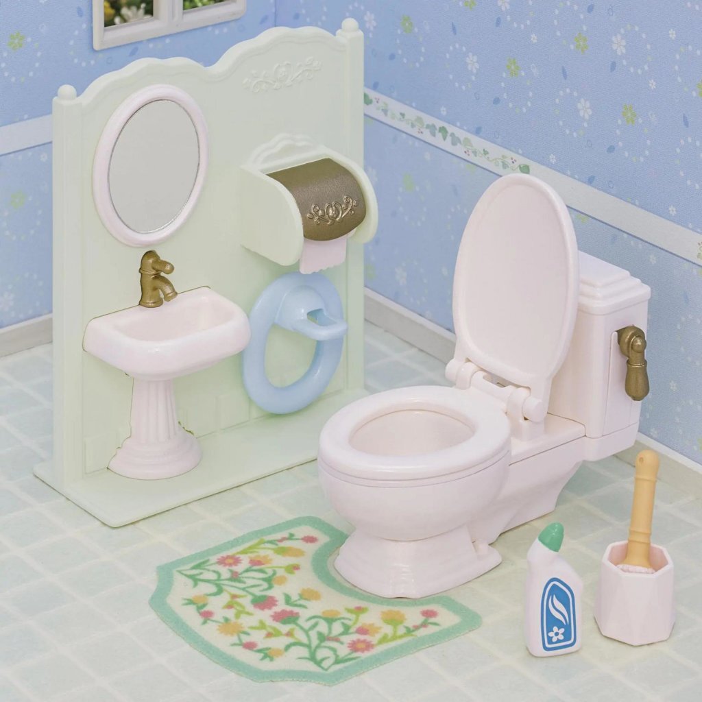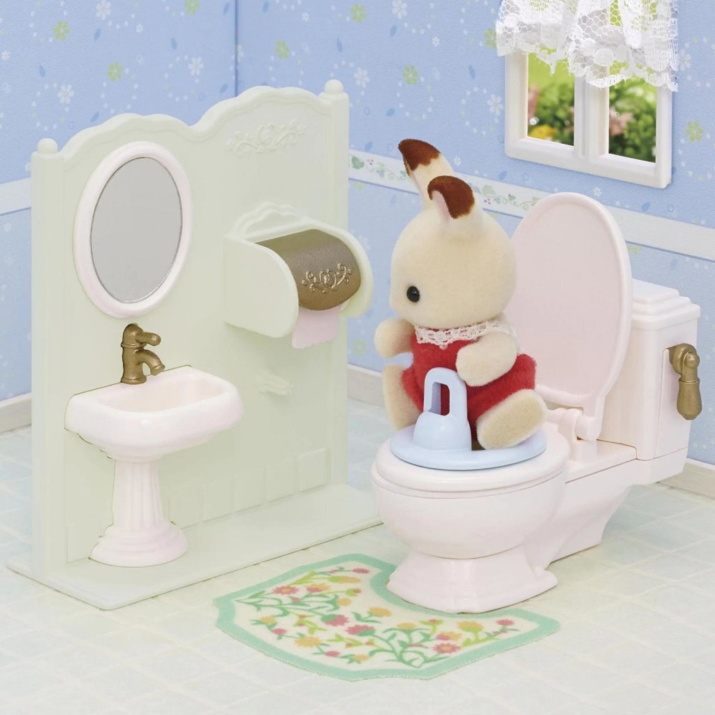 De toiletset bestaat uit een toilet, wastafel, schoonmaakmiddelen, potje en toiletmat. Het toilet kan worden doorgetrokken door aan de hendel te trekken en t toiletpapier kan uitgerold worden. speelfiguren kunnen op t toilet zitten. Stimuleert verhalen verzinnen voor kinderen. Geschikt voor kinderen vanaf 3 jaar.