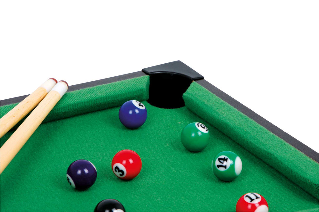 Een goede en speelse training van de fijne motoriek en de oog-handcoördinatie is deze kleine pooltafel! Inclusief 2 keuen, ballen, triangel en krijt. Spannende spellen zijn gegarandeerd.