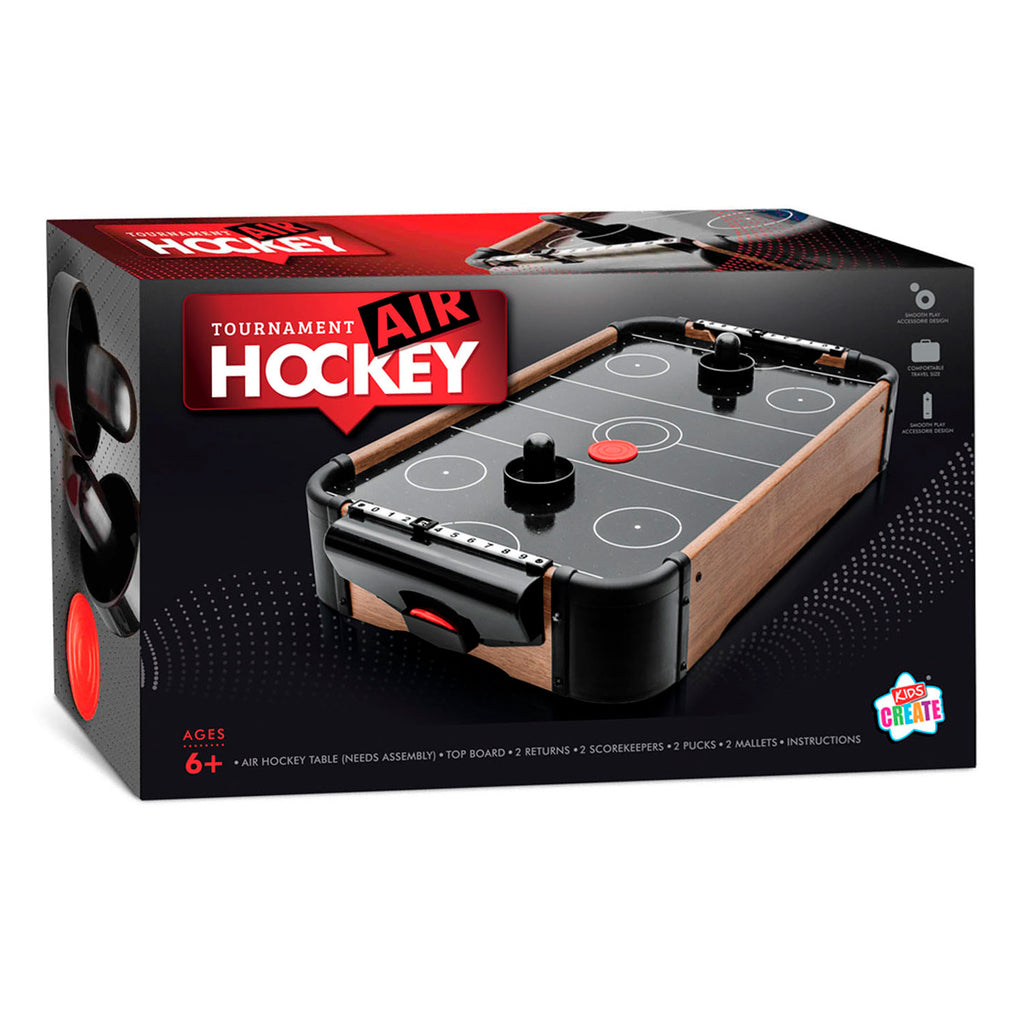 Daag je vrienden uit voor een toernooi air hockey! Zet het air hockey spel op een stevig oppervlak en scoor als eerste negen punten om het spel te winnen. De score kun je goed bijhouden met het scorebord aan beide kanten. De tafel is afgewerkt met een mooi houtpatroon aan de zijkant De air hockey tafel werkt op batterijen.