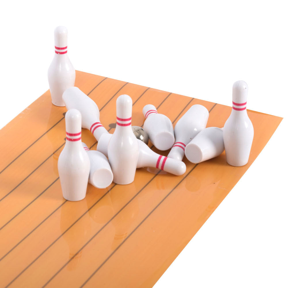 Speel een potje bowlen op de tafel of op de vloer met deze bowlingset. Afmeting bowlingbaan: 21 bij 15,5 bij 4,5 centimeter. Inhoud: de bowlingbaan, 10 minikegels, 1 minibowlingbal en een startblok. Geschikt vanaf 6 jaar.