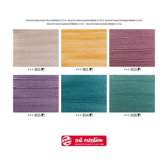 Inhoud: 6x12ml tubes (800 Zilver – 801 Goud – 833 metallicroze – 835 metallicviolet – 834 metallicblauw – 836 metallicgroen).