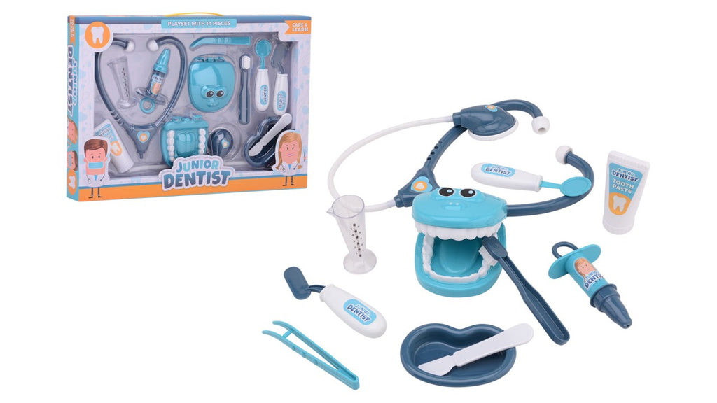 13-delige tandarts speelset met een speelgebit en verschillende tandartsgereedschappen van kunststof. Geschikt vanaf 3 jaar.