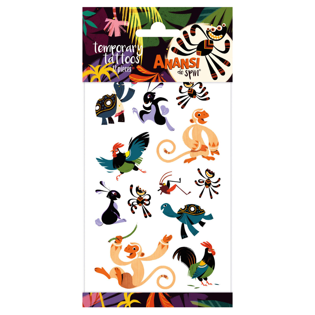 Vel met 12 tijdelijke plaktattoos van karakters uit Anansi de Spin. Geschikt vanaf 3 jaar.