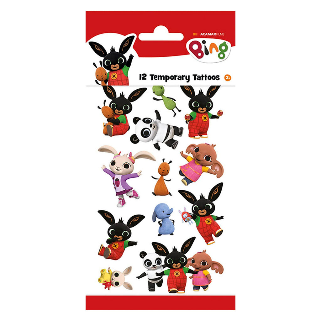 Vel met 12 tijdelijke plaktattoosvan Bing. Niet geschikt voor kinderen jonger dan 3 jaar.