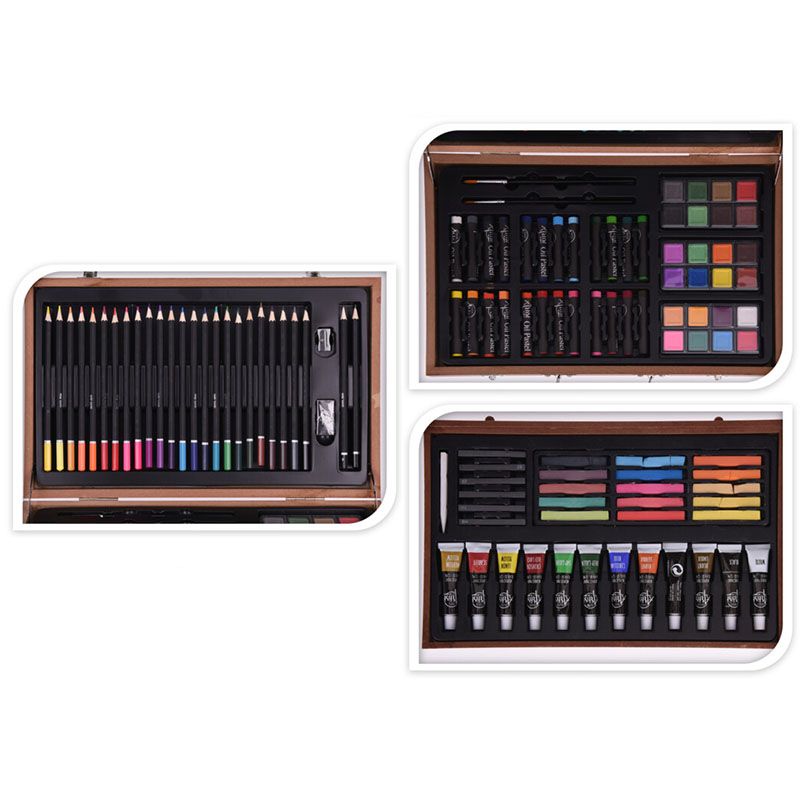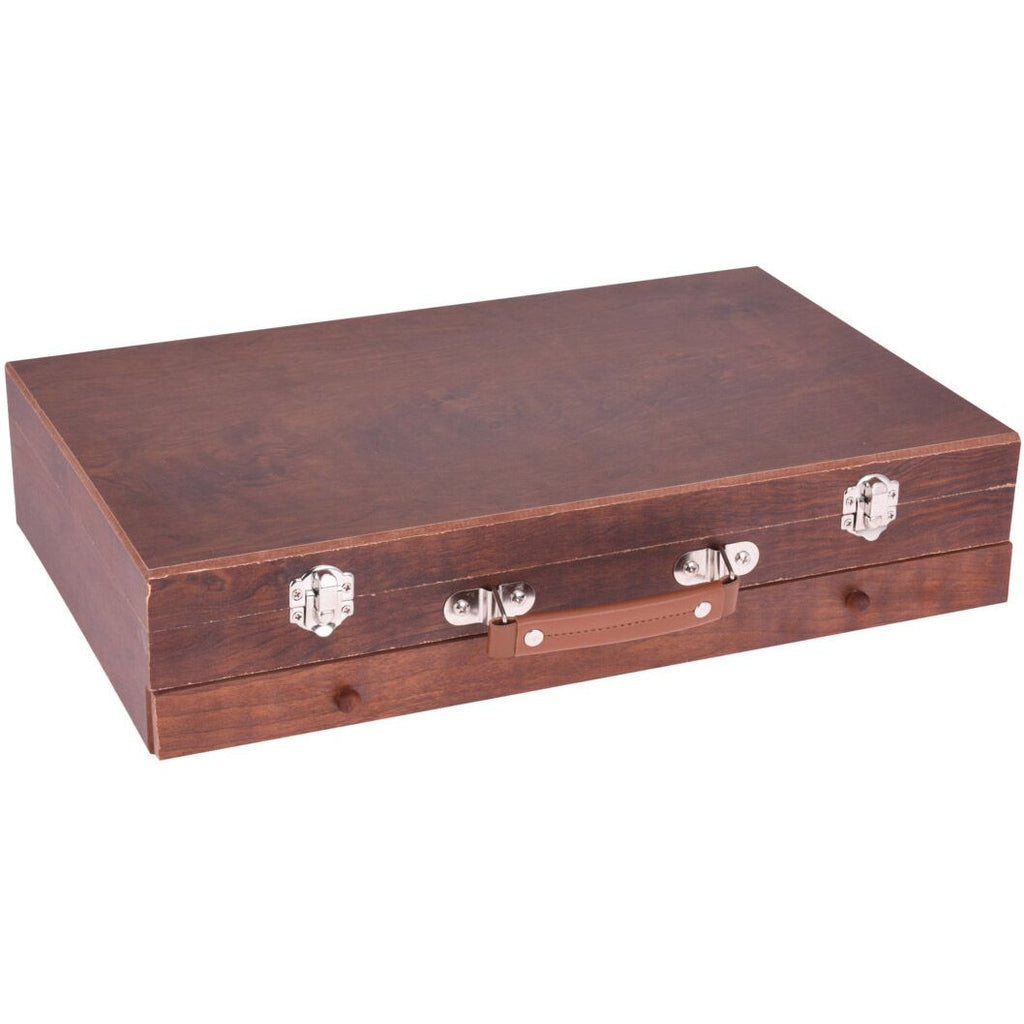 Deze zeer complete kunstschilderkoffer heeft maar liefst 112 onderdelen. Pennen, potloden en verschillende verfsoorten: je hebt alles in één handige opbergkoffer met uitschuifbare lade. De koffer is gemaakt van hout en heeft een handvat en twee sloten.