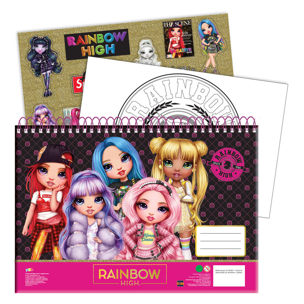 Rainbow High Tekenblok met ringband in A4-formaat met 40 vellen, inclusief een stickervel met de leukste Rainbow High stickers. Geschikt voor kinderen vanaf 3 jaar oud.