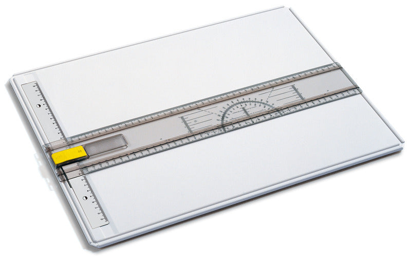 Tekenbord GeoCollege economy. Materiaal: kunststof. Kleur: wit. Te gebruiken voor A3 papierformaat. Uitvoering: greep met geïntegreerde stop. Magnetische klemrail met venster voor de juiste uitlijning van het papier en gradenboog.
