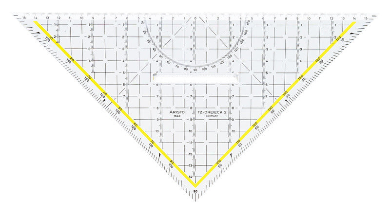 Multifunctionele tekendriehoek. Te gebruiken als liniaal, driehoek en parallelliniaal. Met horizontale en verticale schaalverdeling en gradenboog. Met vaste greep. Met een facetgeslepen zijde aan de lange kant. Voldoet aan de ÖNORM A2134. Lengte 32.5 cm. Materiaal: plexiglas®. Transparant.