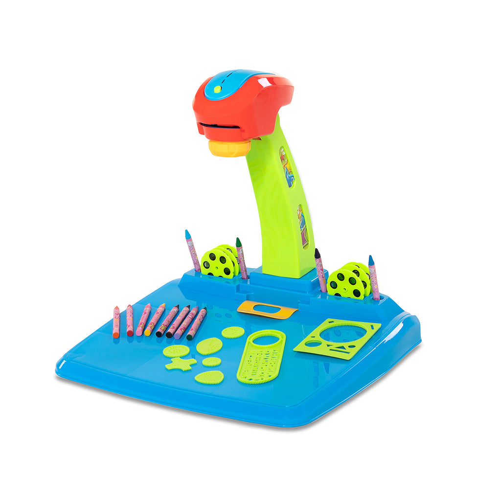 Sierlijke bloemen, schattige dieren en stoere voertuigen! Met de Tekenprojector met Waskrijtjes maak je ze allemaal. Plaats een van de 6 groene schijven met ieder 6 afbeeldingen in het apparaat en laat het licht branden. Op het witte tekenvel onder de projector ontstaat een vrolijke afbeelding die je overtrekt en inkleurt met de 12 bijgeleverde waskrijtjes. Op de 6 schijven staan 36 uiteenlopende afbeeldingen. Bij de kleurrijke Tekenprojector met Waskrijtjes wordt een setje sjablonen geleverd met daarop letters, cijfers, cirkels en andere vormen!