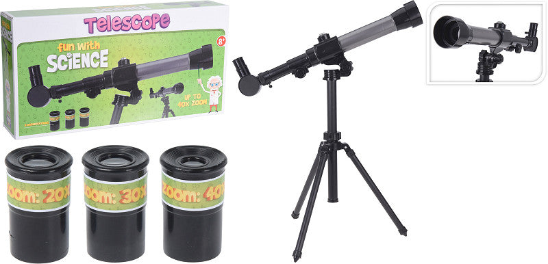 Met deze speelgoed telescoop op standaard kun je tot wel 40 keer inzoomen. De telescoop heeft drie lenzen waarmee de telescoop 20, 30 of 40 keer kan inzoomen.