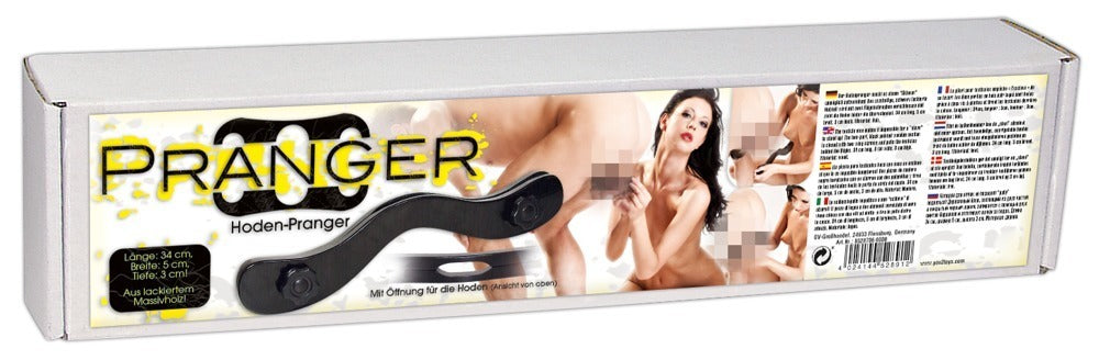 Black testicles pillory made of wood with two screws. Size 34 x 5 x 3 cm.