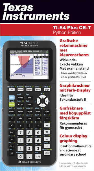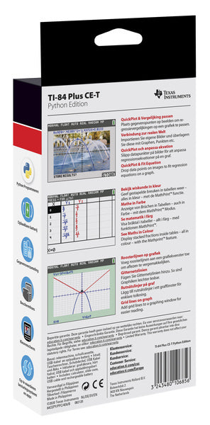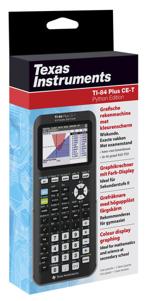 Slanke en moderne grafische rekenmachine met backlight kleurenscherm en oplaadbare batterij. Dit nieuwe model biedt als extra functie de mogelijkheid om te programmeren in Python. Toegestaan op het centrale wiskunde examen 2021! Belangrijkste functies: Vergelijkbare eigenschappen als de TI-84 Plus CE-T. Met Python App. Hoge resolutie, backlight kleurenscherm. Oplaadbare batterij. Met Nederlandse examenstand (verplicht bij de examens wiskunde). De Python App is geblokkeerd in de Nederlandse examenstand. Het mooie van Python is dat je de toepassing van wiskunde kunt laten zien. De Fibonacci-reeks bijvoorbeeld kom je overal in de natuur tegen. Je kunt hier sommen over maken, maar het is interessanter om het voor je te zien. De combinatie van programmeren, wiskunde en iets in werkelijkheid zien gebeuren maakt dit een krachtig instrument. Met de TI-Plus CE-T Python Edition kunnen leerlingen code schrijven en experimenten doen met de TI-Innovator Hub en de robotauto TI-Innovator Rover. Ideaal voor STEM-projecten! De voordelen: Geschikt voor vakoverstijgende projecten. Te gebruiken voor profielwerkstukken bij de bètavakken. Optimaal voorbereid op het toekomstgerichte curriculum. Functionaliteit omvat o.a. exploratie van functies en grafieken, ongelijkheden, statistiek, en meten met sensoren en modelleren van gemeten data. Math Print: Voer wiskundige symbolen, formules en gestapelde breuken exact in en bekijk ze zoals ze in boeken worden weergegeven. Scrol door de geschiedenis van berekeningen en roep invoer/uitvoer snel op. Rekenen met breuken met behulp van eenvoudig te gebruiken templates. Volg een functie met elke reeds aanwezige breuk (of met een door u gedefinieerde breuk) als de stapgrootte. Kies hoe u berekeningen op het scherm wilt zien: als decimale benaderingen of als breuken. Kies verschillende weergavemodi, zoals: n/d Un/d, Answer: AUTO DEC FRAC, GOTO FORMAT GRAPH: NO YES, STAT DIAGNOSTICS: OFF ON. Deze grafische rekenmachine is voorgeladen met diverse wiskunde-applicaties en de Vernier meet-applicatie, die zijn toegestaan in de nieuwe examens. Ingebouwde USB-poort. Verbeterd scherm (contrast). Interne klok.