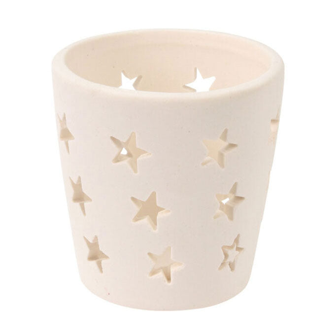 Mooie theelichthouder in gebroken wit met kerstboom- of kerstster-design. De theelichthouder is ca. 6,5 centimeter hoog.