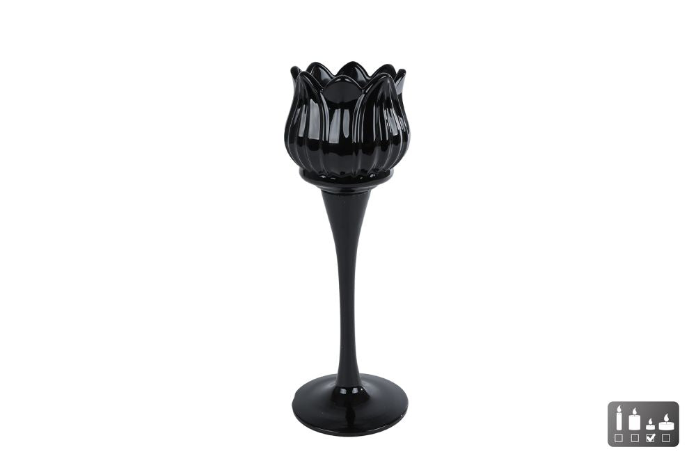 Theelichthouder Tulip zwart glas 7x7x22cm