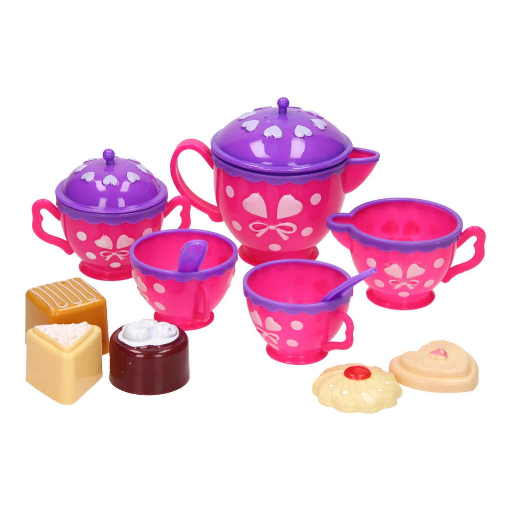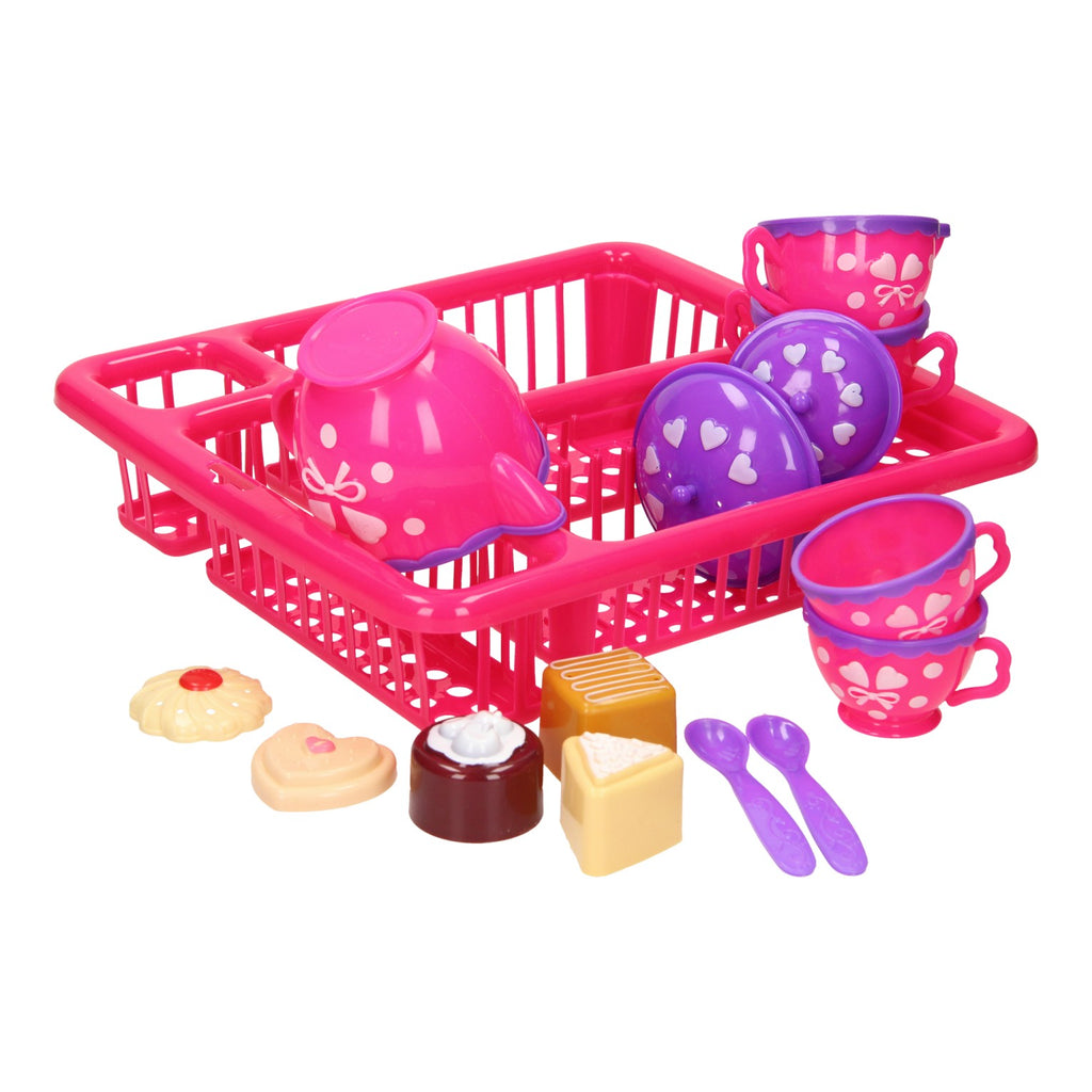 Serveer thee en gebakjes met dit roze met paarse theeservies. De kopjes en de theepot zijn versierd met hartjes en strikken. Afmetingen afdruiprek: 30 bij 28 bij 8 centimeter. De diameter van de theepot is 9 centimeter, de hoogte 10 centimeter. Inhoud van de set: afdrukrek, theepot, drie theekopjes, een suikerpotje, twee lepeltjes en vijf gebakjes. Gemaakt van kunststof.