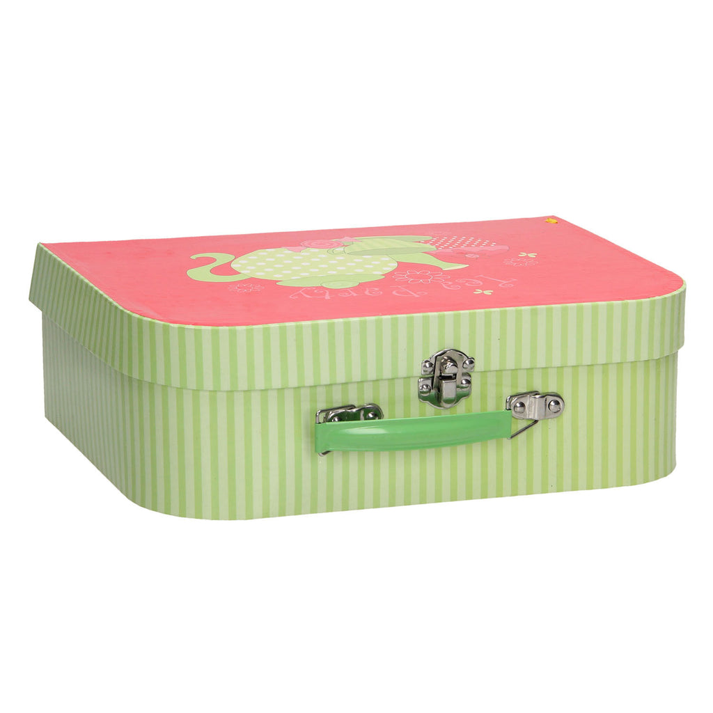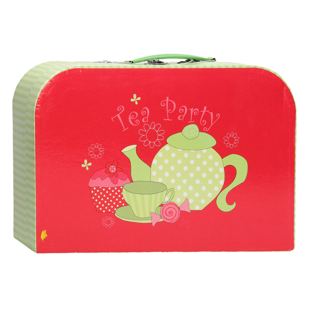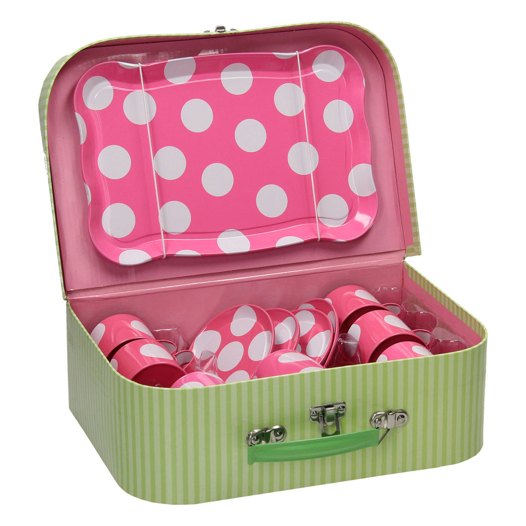 Picknicken en een lekker kopje thee of koffie drinken! Dit theeservies zit in een groen gestreepte koffer. Het tinnen theeservies bestaat uit een dienblad, 4 schoteltjes, 4 kopjes, een koffiepot, melkkannetje en een suikerpotje.