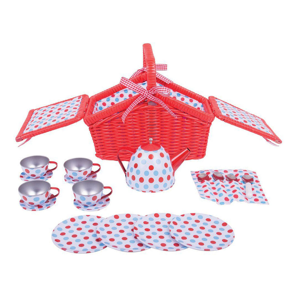 Mooi gevoerde picknickmand met schattig theeservies van metaal. Deze heerlijke theeset bestaat uit een rode rieten picknickmand met vier kopjes en schotels, een theepot met een afneembaar deksel, vier borden en vier theelepels in hun eigen polkadot print. De kindertheeset bevat alles wat je kleintje nodig heeft om het perfecte theefeestje voor vrienden en familie te organiseren. De rode rieten picknickmand maakt het een ideale reisset en zorgt ervoor dat je kleine gastheer ervoor kan zorgen dat de set veilig wordt opgeborgen! Een geweldige manier om creatief en fantasierijk rollenspel aan te moedigen.