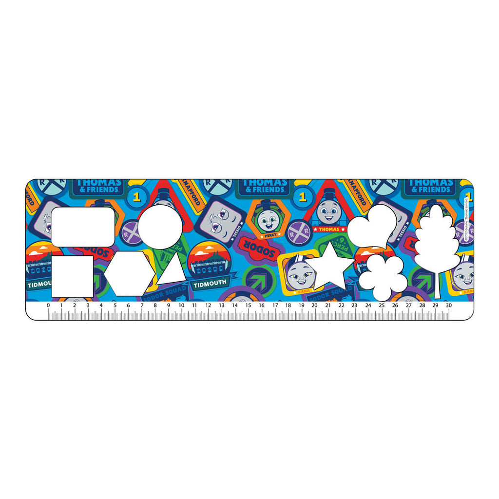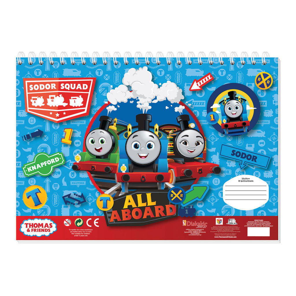 Thomas de Trein Schetsblok met kleurplaten, sjabloon en stickervel. Het tekenblok bestaat uit 2 kleurplaten en de rest van de pagina's zijn blanco om zelf creaties te kleuren.