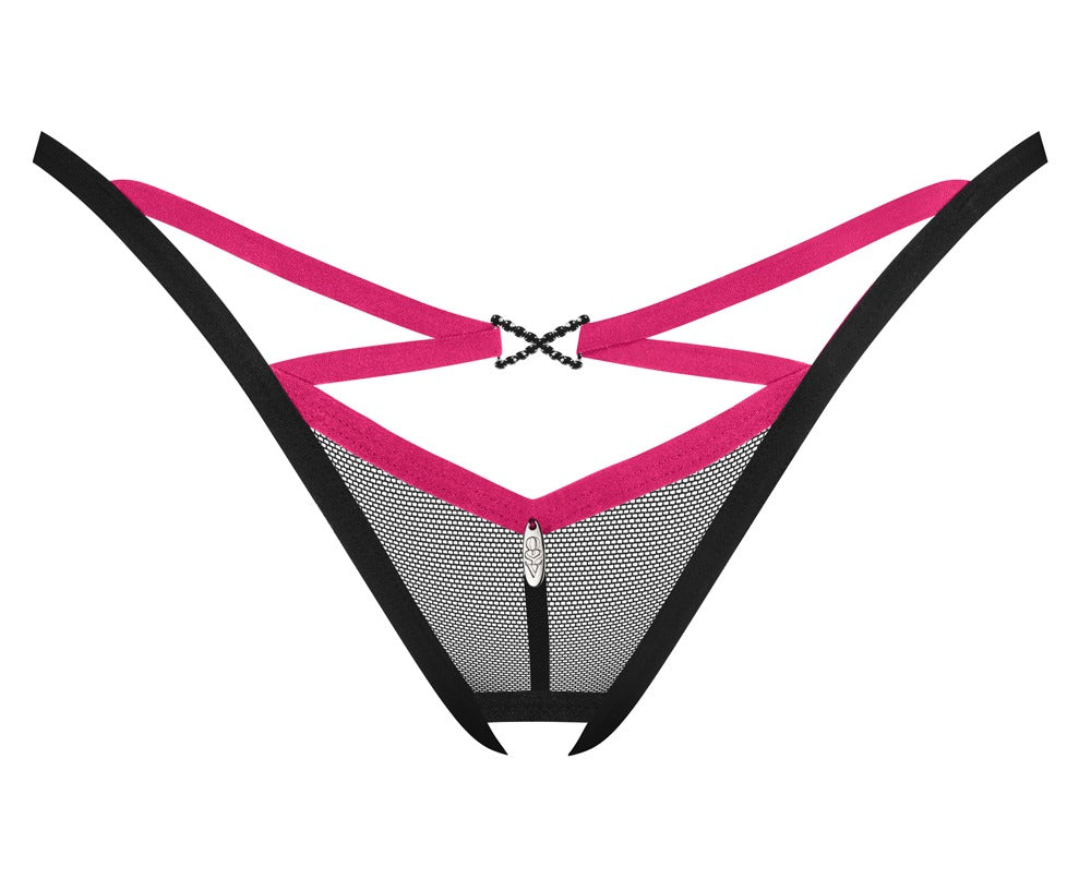 The crotchless, transparent black thong Novenes from Obsessive is made out of soft powernet material. There are pink straps at the front and a beautiful rhinestone element at the front of the waistband as well. It is seductively open in the crotch area.
