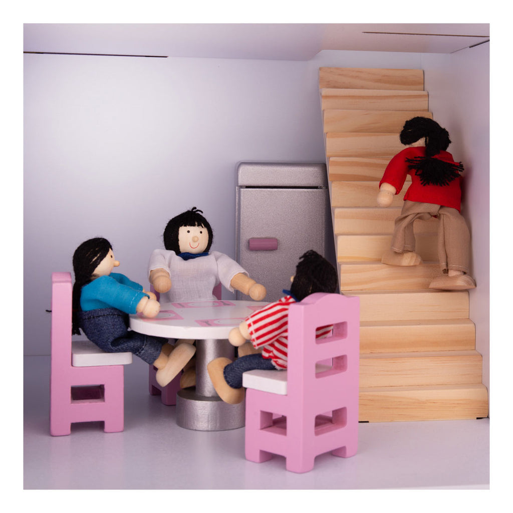 - Bestaat uit: poppenkoelkast/-vriezer, poppentafel en vier poppenstoelen, twee voedselaccessoires en een poppenkeuken met een wasbak en een fornuis.