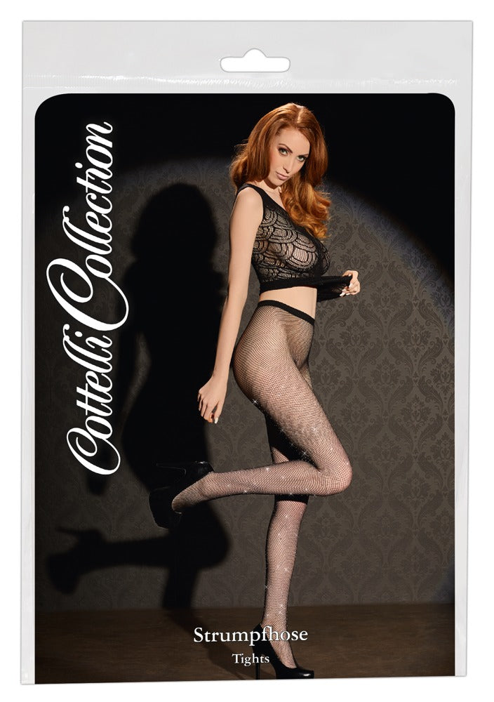 These black fishnet tights with an elastic waistband are strengthened at the toes and decorated with differently sized glittering rhinestones between ankles and thighs - an absolute eye-catcher!