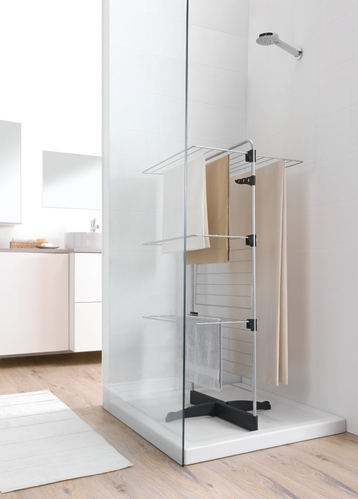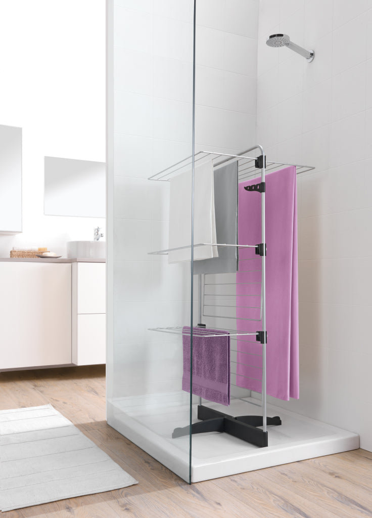 De Thunder is een compacte drooogtoren die je op veel plekken in huis kunt gebruiken. De droogtoren met 22 meter drooglengte is ideaal voor kleine ruimten dankzij de 3 etages en de onafhankelijk op te hangen rekkenGebruikJe kunt kiezen of je alle rekken gebruikt of alleen een paar; in dat geval kun je de droogtoren half openen en deze tegen een muur plaatsen. Anderzijdsd kun je het rek ook geheel openen en alle rekken gebruiken, bijvoorbeeld 3 aan één kant en 1 rek aan de andere kant voor langer wasgoed zoals jurkjes, handdoeken of broeken. Op de hoeken bovenin kun je kledinghangers hangen aan de ophanghaken.KwaliteitHet droogrek is gemaakt van metaal en heeft een sterke coating die roestvorming tegengaat, anti-statisch is en makkelijk schoon te maken. De kunststof elementen zoals de hoeken en poten zijn satijnzwart en zorgen voor sterke verbindingen en stabiliteit.De maximale afmetingen in gebruik zijn 58 x 54 x 123 cm.Als je het droogrek niet gebruikt en opvouwt zijn de afmetingen 58 x 6 x 123 cm, hierdoor is het makkelijk opbergbaar in een smalle ruimte.Na gebruik buiten, binnen opbergen.Productvoordelen en specificaties: