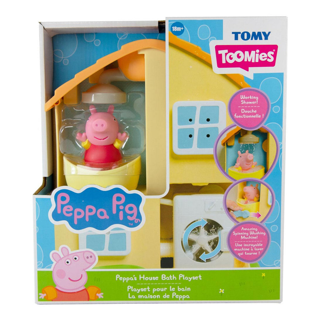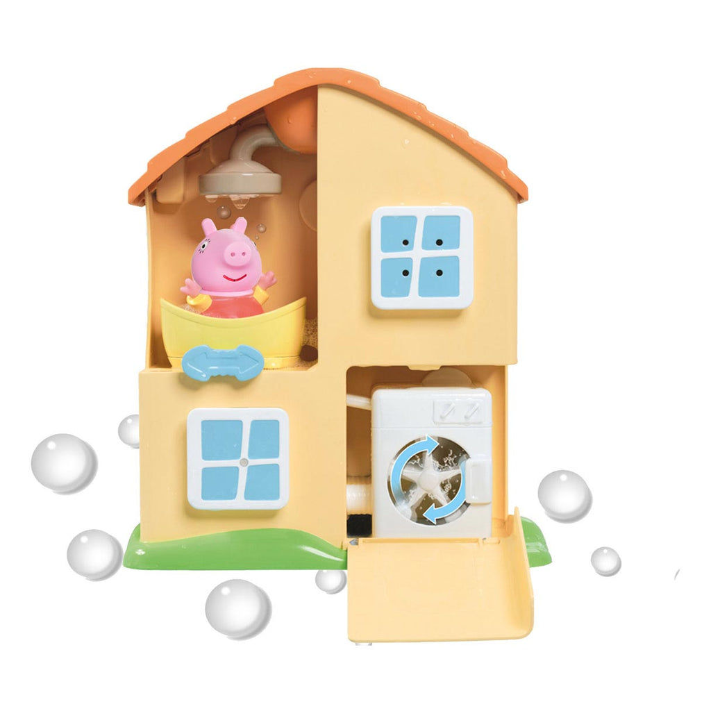 Beleef badplezier met Peppa Pig! Dit Speelhuis bevestig je eenvoudig met de zuignapjes aan de badrand en heeft allerlei leuke speelfuncties om je kleintje mee te vermaken in bad. De twee ramen van het huis kun je eruit halen. Het ene gebruik je om water mee te scheppen en het andere heeft gaatjes, dus daar kun je jezelf lekker mee douchen! Giet water bovenin het huis, dan zal ook Peppa's douche aangaan. Zie je Peppa lekker onder zijn douche staan? En als er een wasje gedraaid moet worden, dan gaat de wasmachine echt draaien met water! In bad gaan was nog nooit zo leuk! Afmeting huis: 23x8x26cm (lxbxh). Leeftijdsindicatie: 18 maanden+.