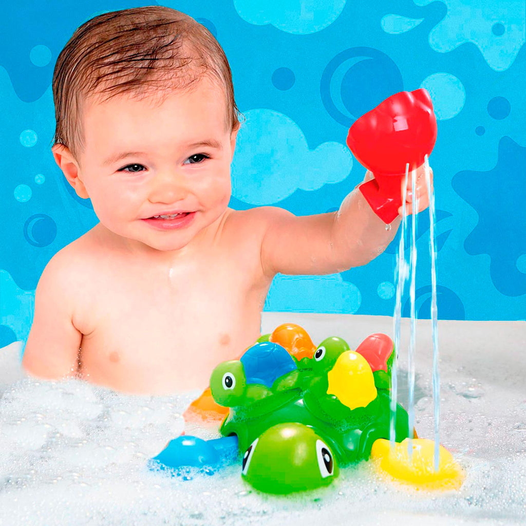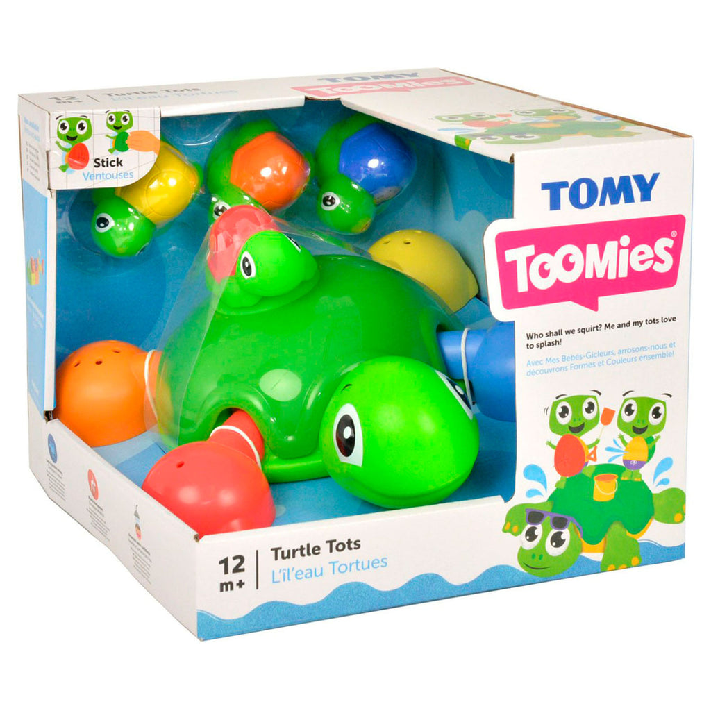 Knijp in één van de babyschildpadjes om met water te spuiten of plak één van de schildpadjes op de rand van het bad of op de muur.