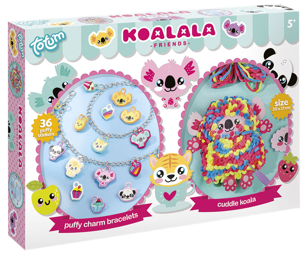 Happy Eyes trend 2 in 1 set. Maak 2 Koalala bedelarmbanden met puffy stickers en versier je eigen Koalala kussen (formaat 20x21cm)