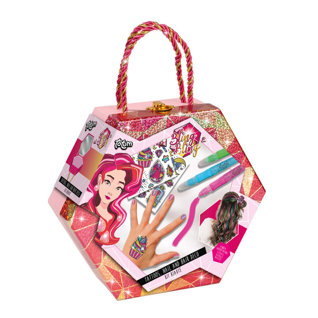Maak jezelf nog mooier met de Totum Bling Bling - Haarkrijt en Glitter Tattoo's. In deze roze glitter koffer zitten 3 haarkrijtstiften waarmee je je haar roze, blauw en groen kunt verven en gebruik de vier velletjes glitter tattoos om ook jouw huid te laten shinen! De set bevat ook glitter nagel tattoos om je nagels te voorzien van glitter en glamour. Met het bijgeleverde elastiek maak je van je haren een mooie staart of knot.