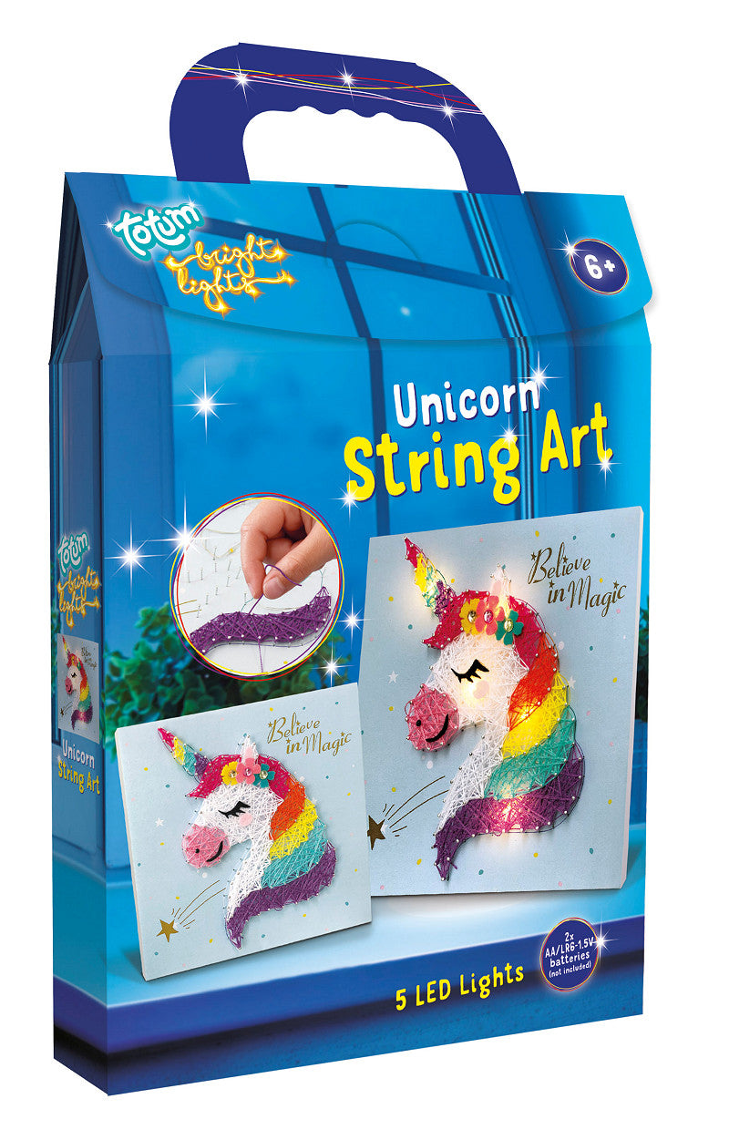 Maak een mooi schilderijtje met dezeTotum Bright Lights eenhoorn String Art set met 5 LEDS. Geschikt voor kinderen vanaf 6 jaar.