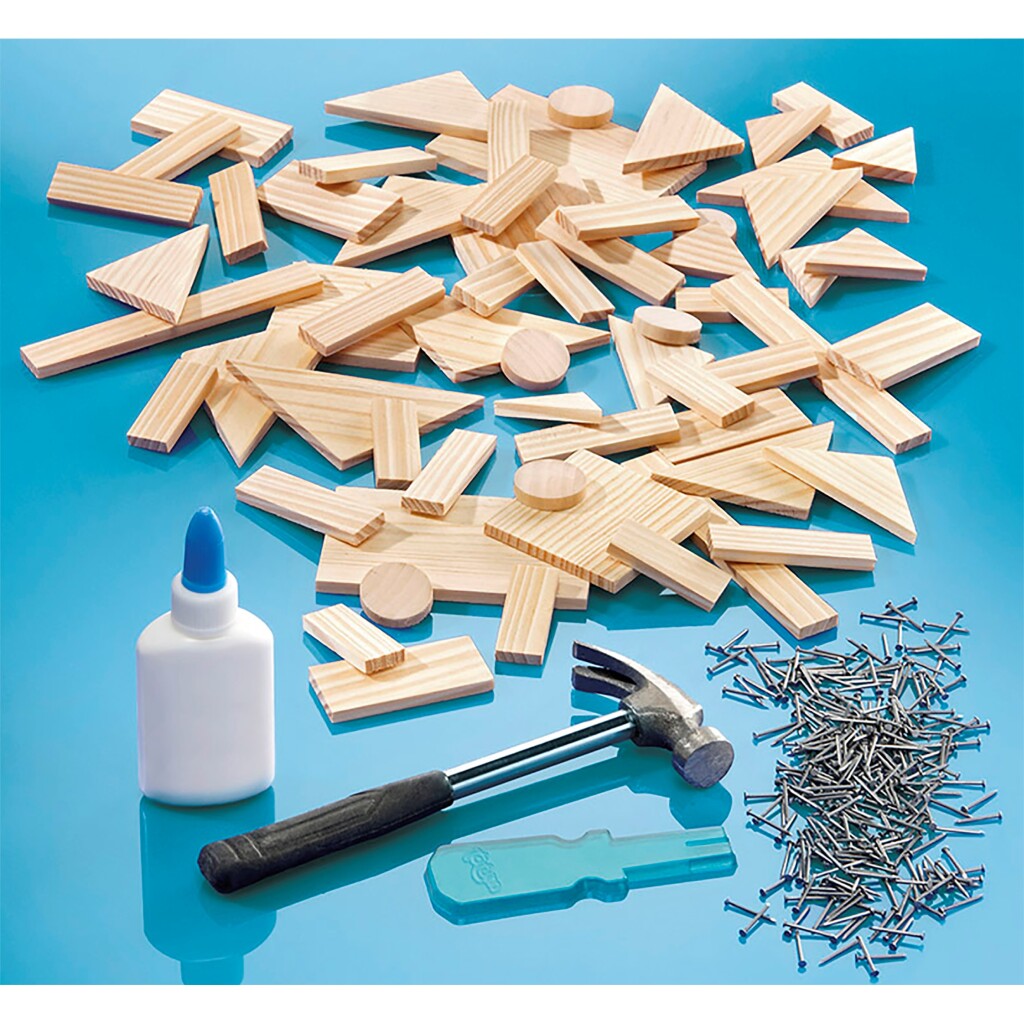 - Veilig spijkerhulpje om niet op je vingers te slaan en heel veel stukjes hout