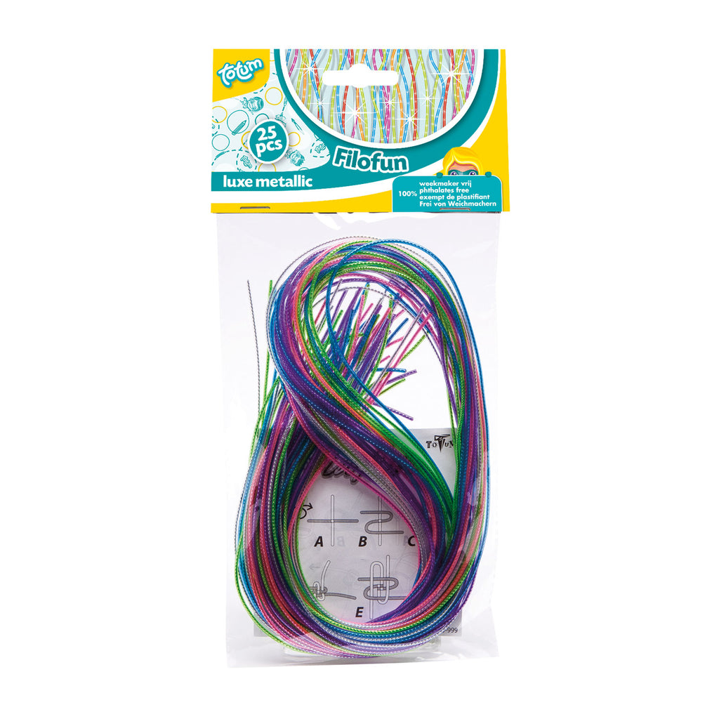Maak de mooiste sieraden en sleutelhangers met deze luxe metallic filofun van Totum. De set bevat 25 draden van stevig kunststof in glinsterende metallic kleuren. Inclusief voorbeelden.