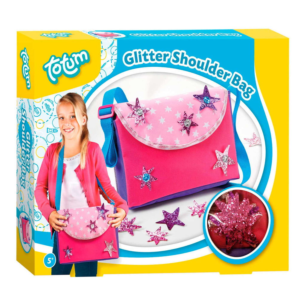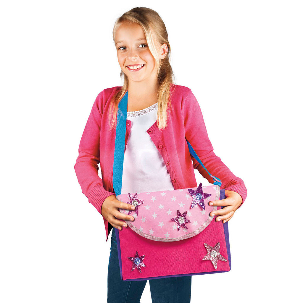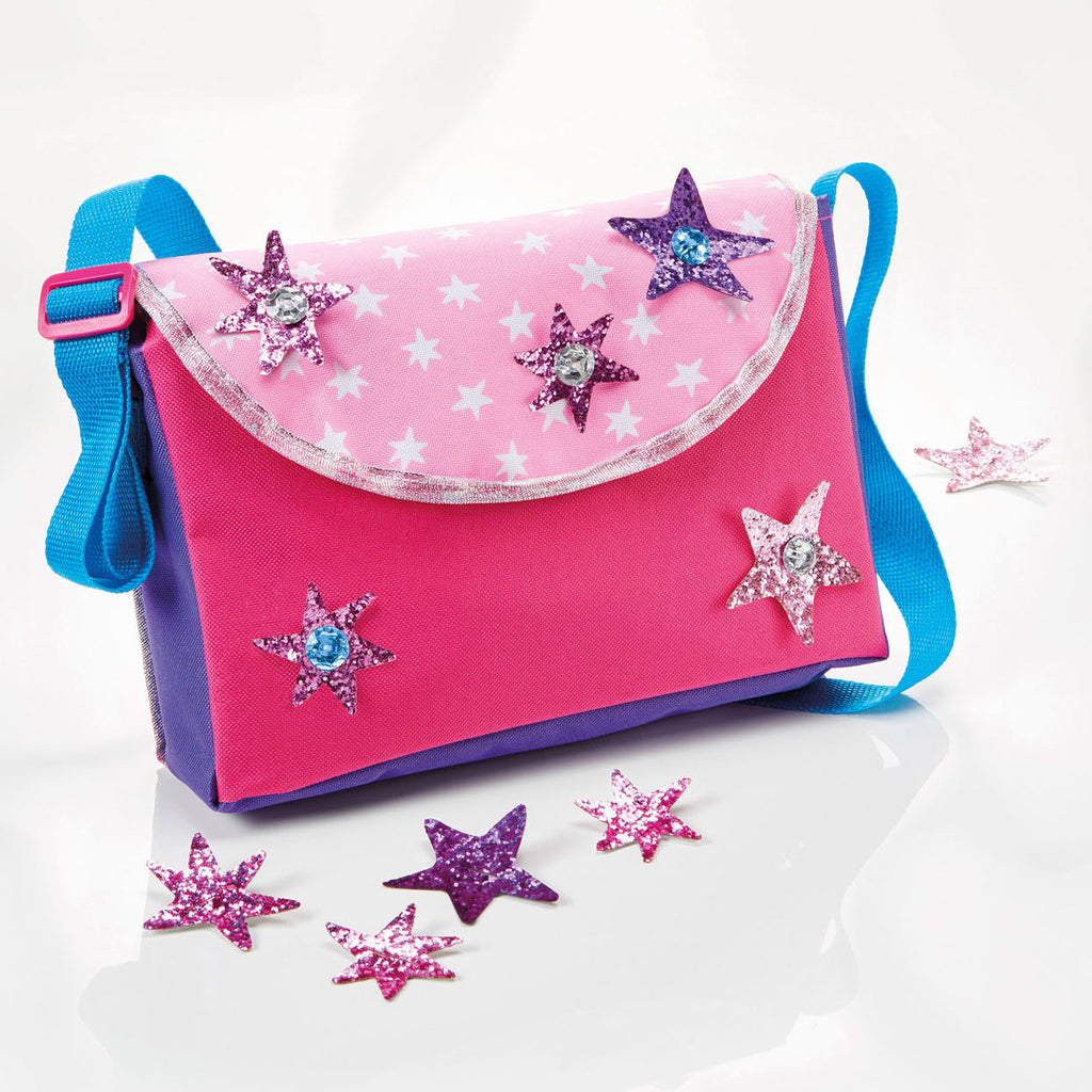 Versier je eigen schoudertas. Een schoudertas met leuk design welke je helemaal eigen kan maken. Versier de tas met de glittersterren en diamanten.