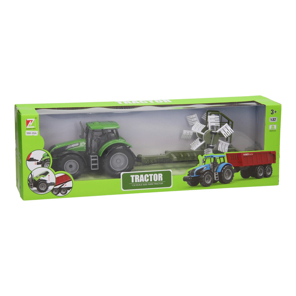Deze kunststof tractor met groene hooischudder is speciaal ontworpen om hooi te schudden op het land. Het gras op je boerderij kan op deze manier sneller drogen zodat het tot balen geperst kan worden. De hooischudder kan losgekoppeld worden van de tractor en de armen van de hooischudder zijn in- en uitklapbaar waardoor hij ook over de weg vervoerd kan worden. De motorkap van de tractor kan ook omhoog. Geschikt vanaf drie jaar. De tractor is 20 x 20 x 10 cm en de aanhanger heeft een lengte van 24 cm. De totale lengte van de tractor met aanhanger is 44 cm. De tractor is verkrijgbaar in het groen, blauw en rood.