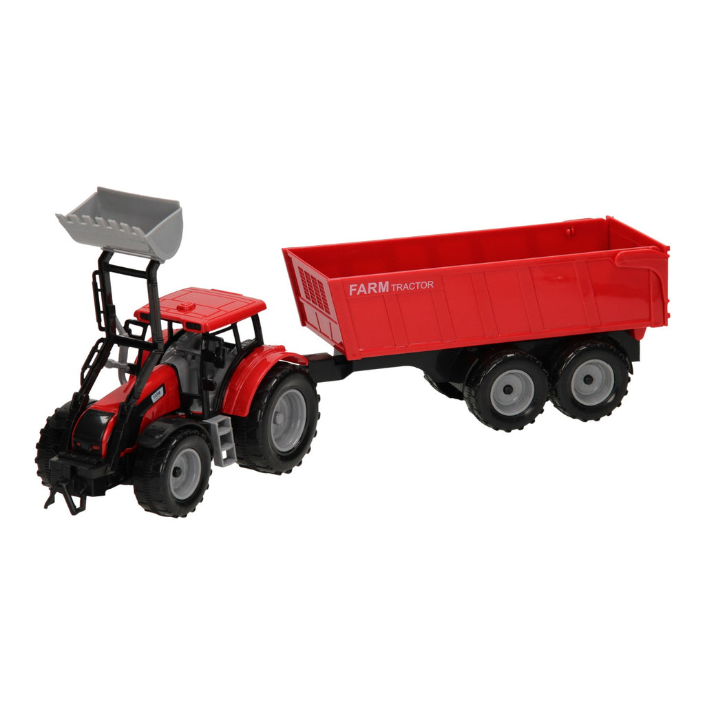 Deze stoere tractor is gemaakt van kunststof en onmisbaar op het land. Door de beweegbare voorlader is er gegarandeerd speelplezier. De rode aanhangwagen kan losgekoppeld worden van de tractor en is omhoog en omlaag te bewegen. De achterklep van de aanhangwagen kan ook omhoog zodat de goederen gelost kunnen worden. De motorkap van de tractor kan ook omhoog. De tractor is 20 x 20 x 10 cm en de aanhanger heeft een lengte van 24 cm. De totale lengte van de tractor met aanhanger is 44 cm Geschikt vanaf drie jaar. De tractor is verkrijgbaar in het groen, blauw en rood. Schaal 1:32, past bij de Kids Globe Stallen en Loodsen.