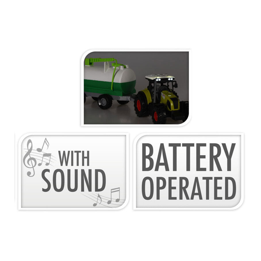 Speelgoedtractor met twee aanhangers (schudder en aanhanger met boomstammen). De tractor kan rijden dankzij een frictiesysteem en heeft licht- en geluidseffecten. De tractor is 13 centimeter lang en de aanhangers ca. 21 centimeter. 3 LR44-batterijen inbegrepen. Geschikt voor kinderen van 3 jaar en ouder.
